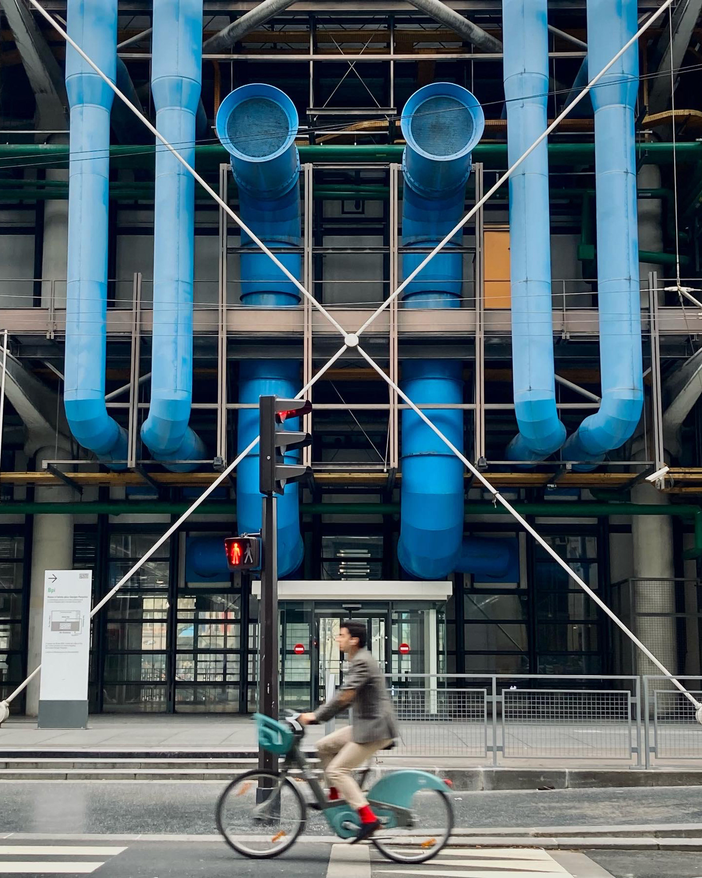 Each shot is meticulously framed to highlight the building’s essence by placing the subject in a central axis amid the vibrant, exposed tubes and structural elements that define its exterior. By positioning the subject at the heart of this visual symphony, I aim to emphasize the interplay between human presence and architectural spectacle.